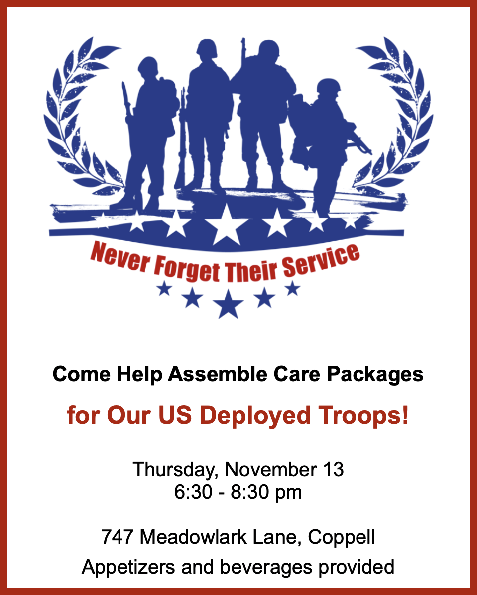 Instead of a November General Meeting – Bring a friend and join us in preparing care packages for 120 soldiers deployed overseas. Congresswoman Beth Van Duyne generously sponsored the Care Package items, but we need your help to stuff the packages. Join us for a meaningful and fun evening as we support the BRAVE TROOPS who keep us FREE!